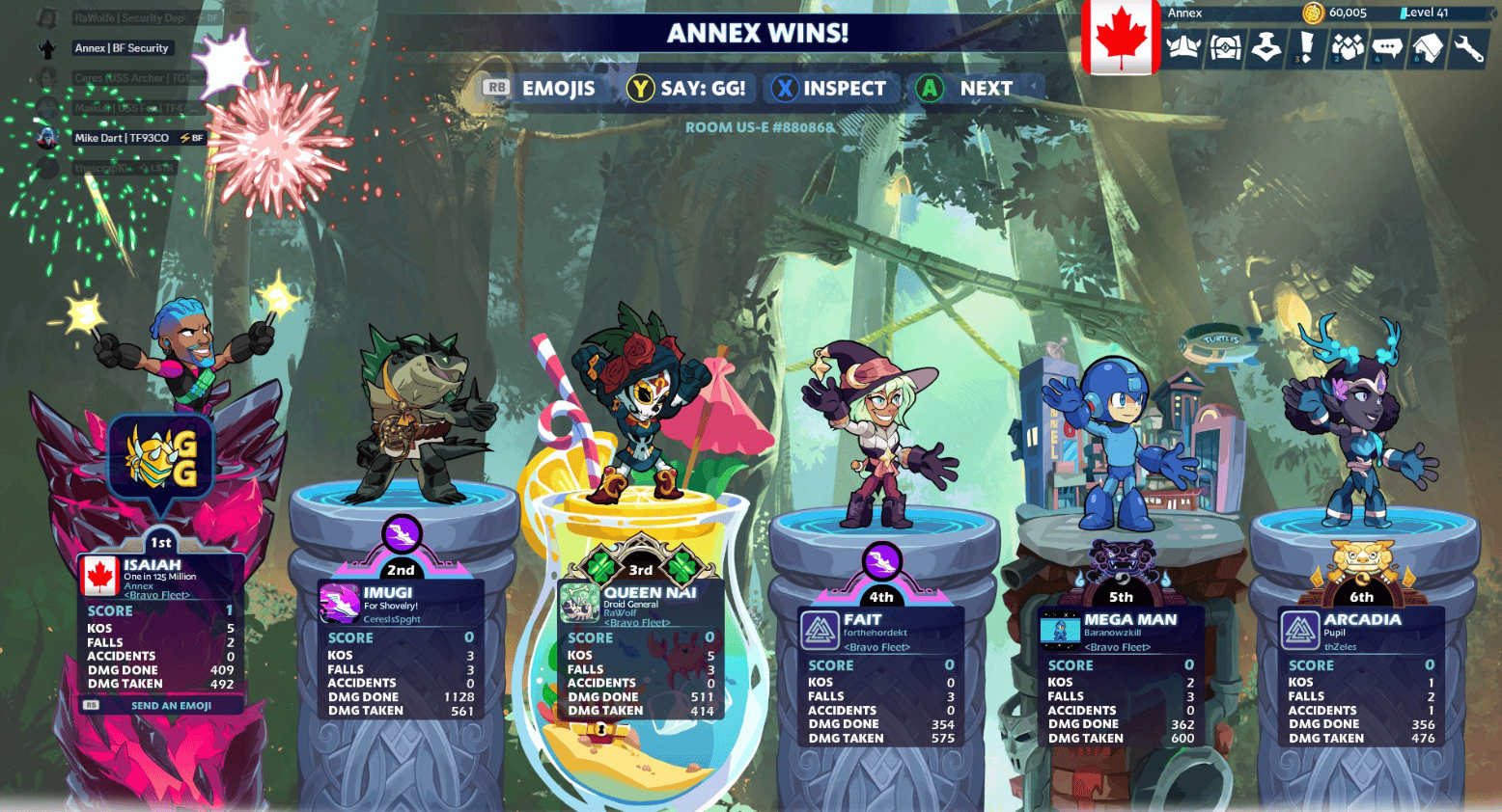 To all officers in the Fourth Fleet! We will be implementing a training course over the next few weeks that emphasizes hard-hitting melee combat techniques. Gather your crewmates and report to the holodeck to load up the Brawhalla program. Conduct as many exercises as you like, but you may only use the results of one single session in your submission. The goal will be to cause as much damage as you possibly can to the sum of your opponents. The crewman with the most damage wins.