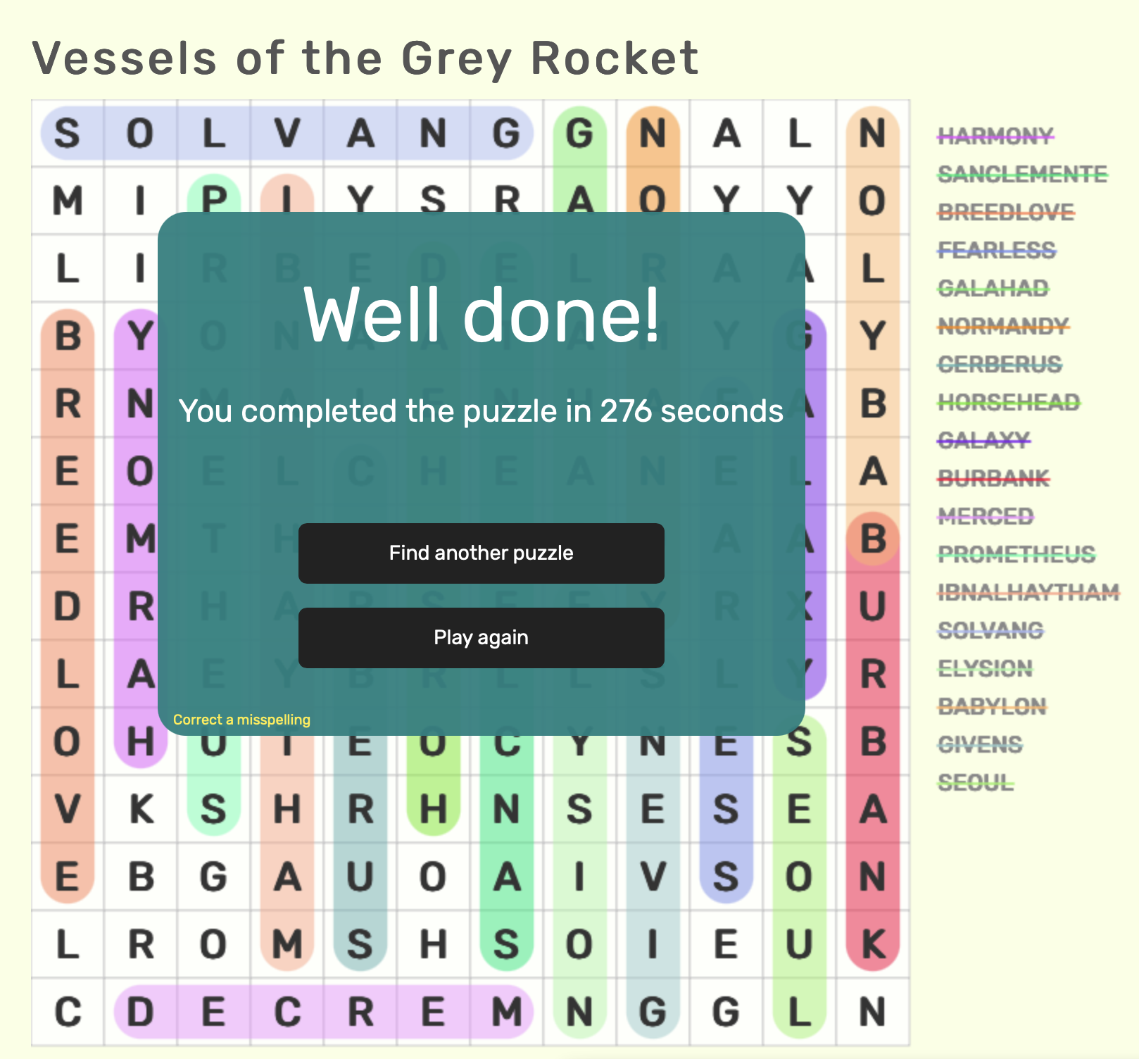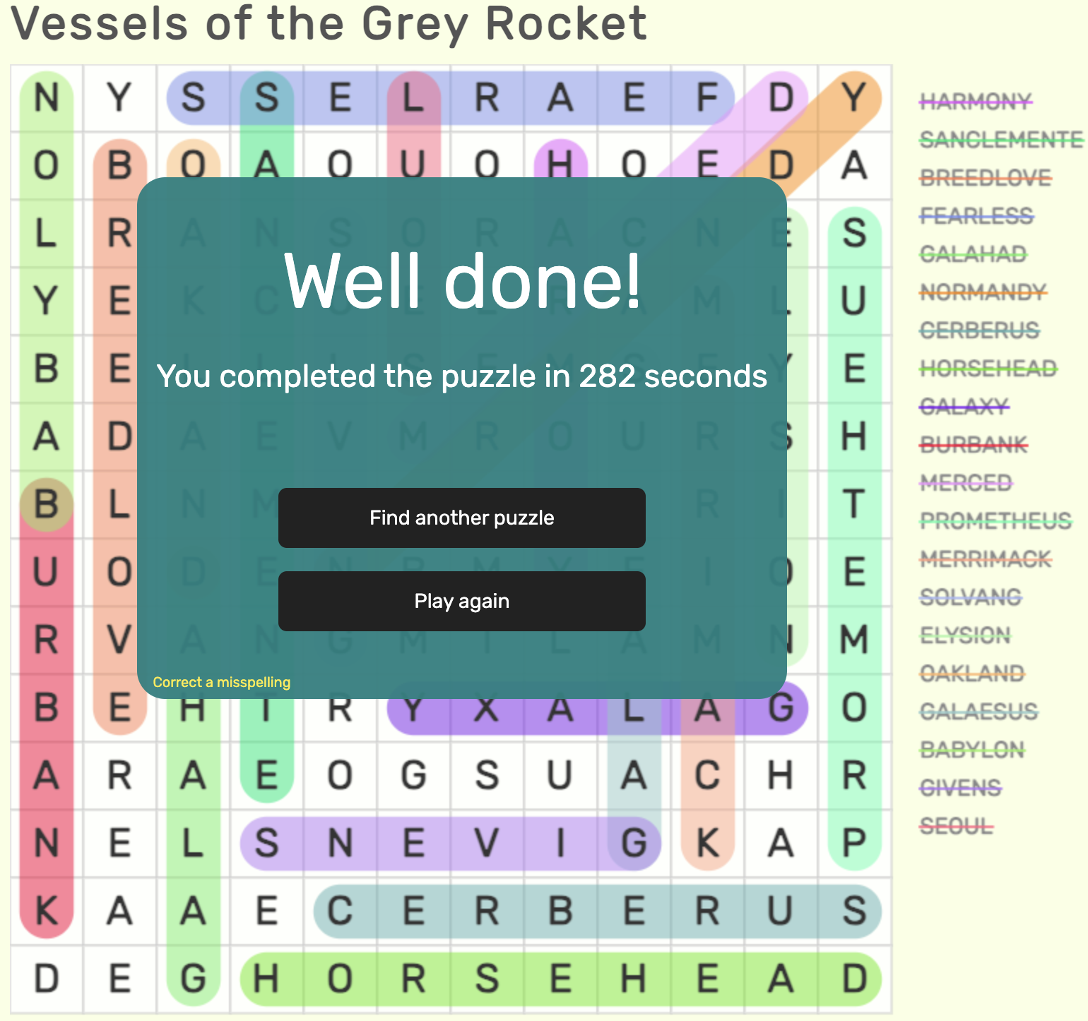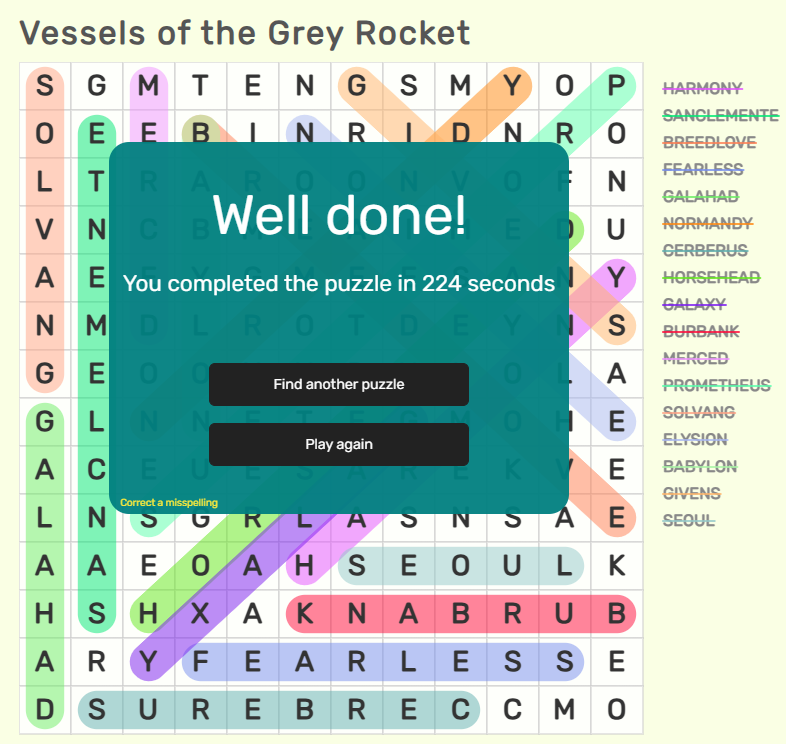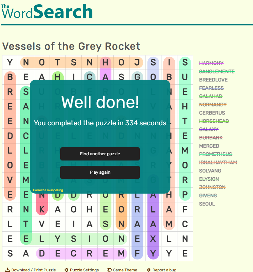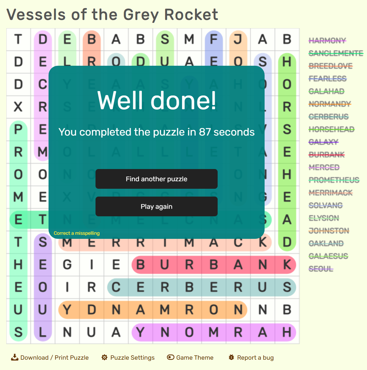 Task Force 17, otherwise known as “the Grey Rocket”, has grown to include a wide array of starships, each with a proud name and history. However, a communications mishap has scrambled their vessel names into a coded matrix of letters.
