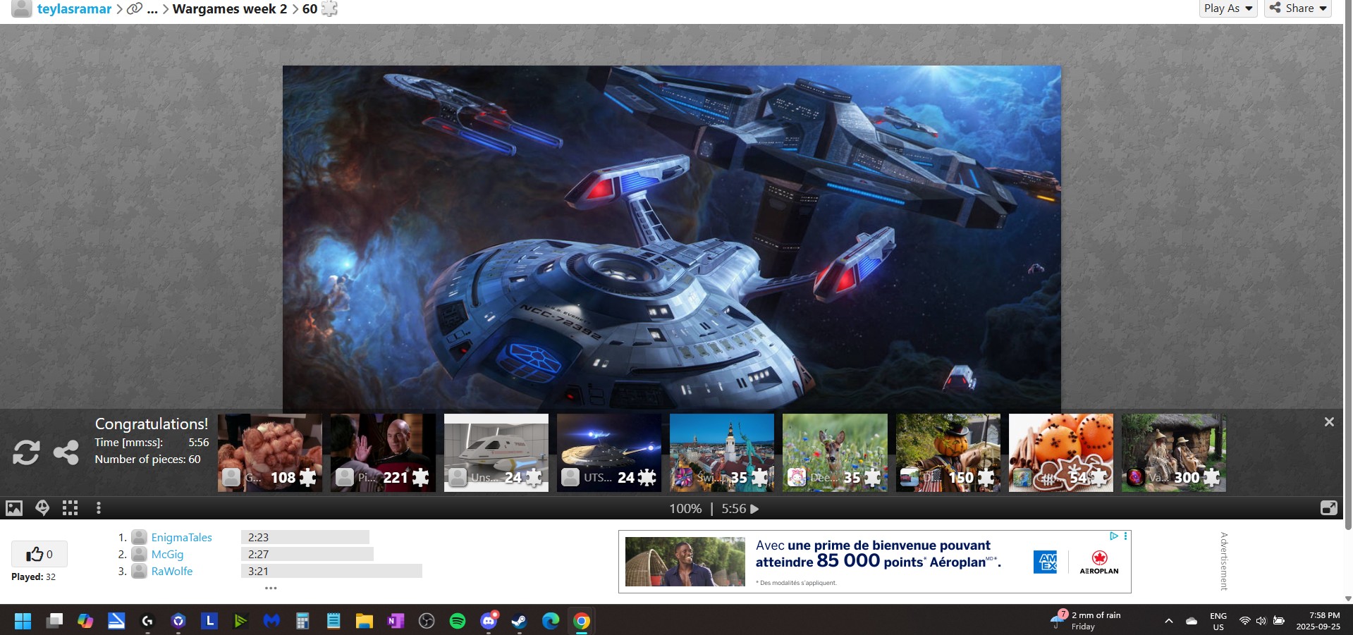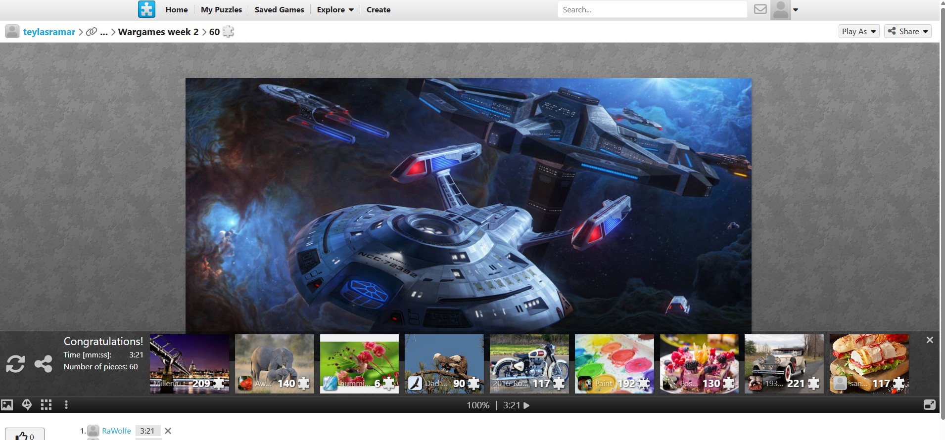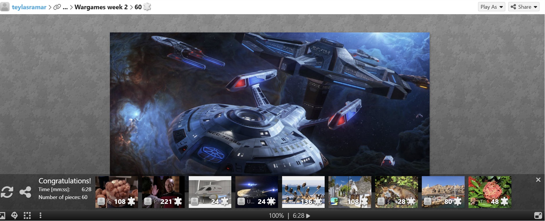 - Participants must submit a screenshot of their puzzle, showing the final time and piece count. Failure to include ANY of these pieces of information will disqualify your entry.