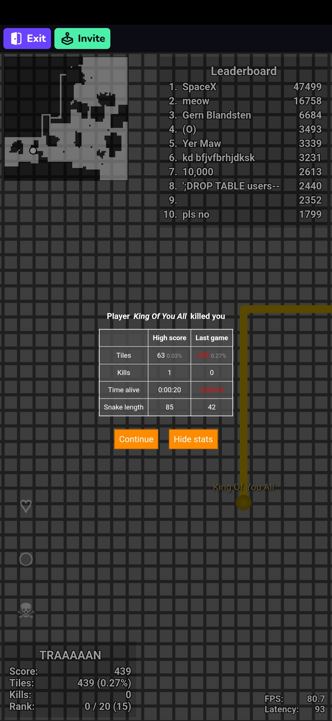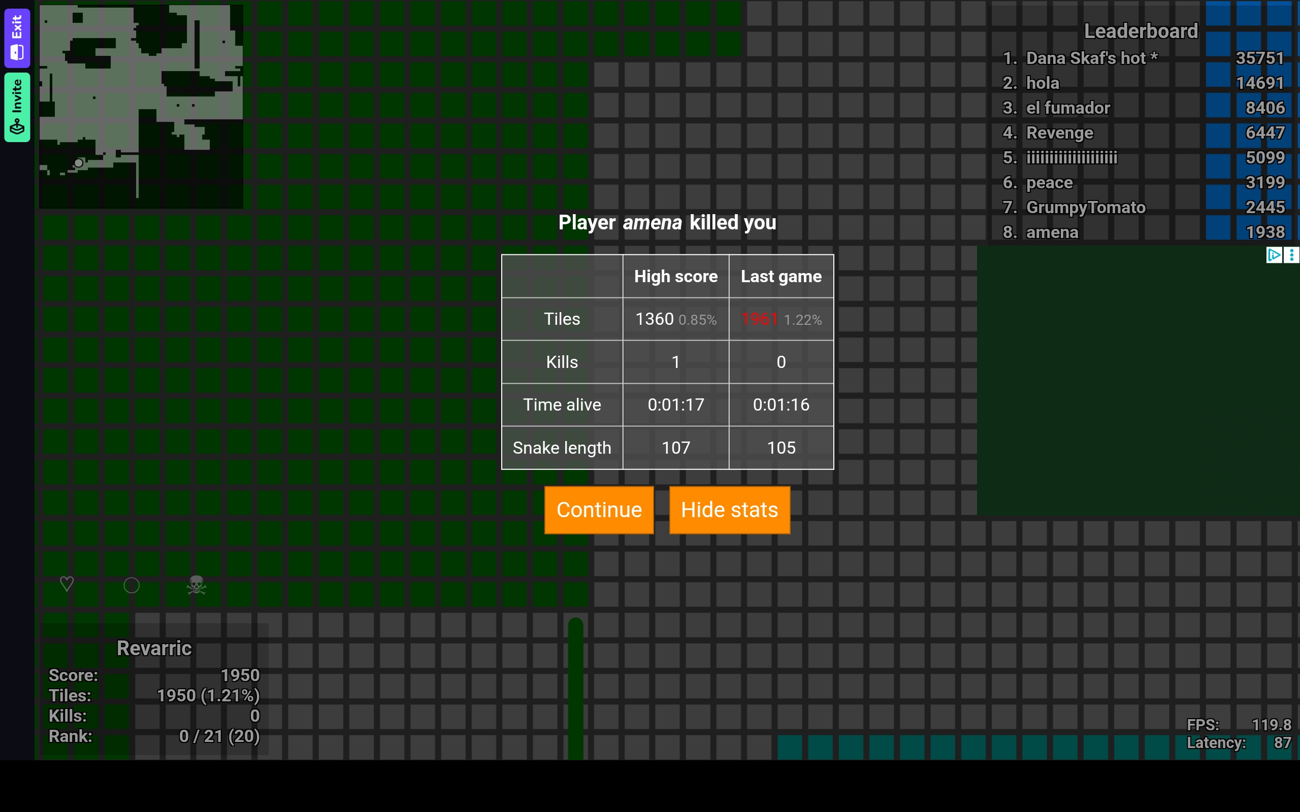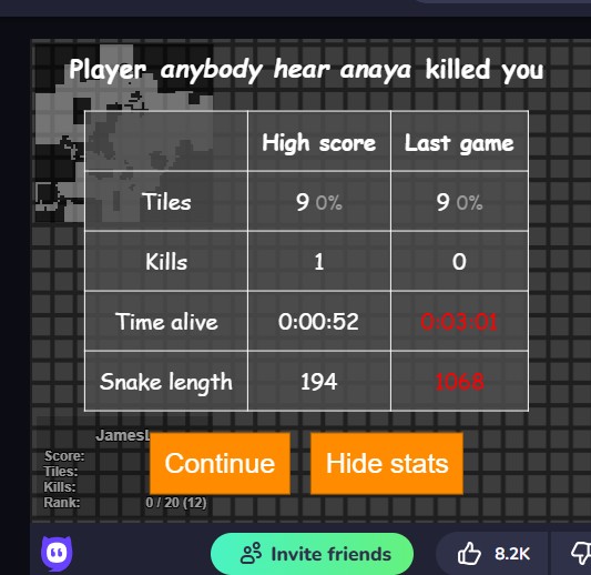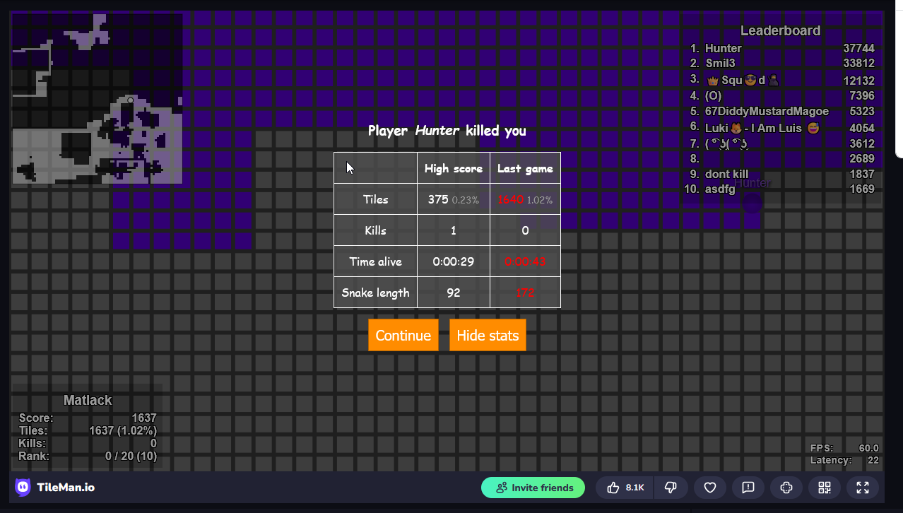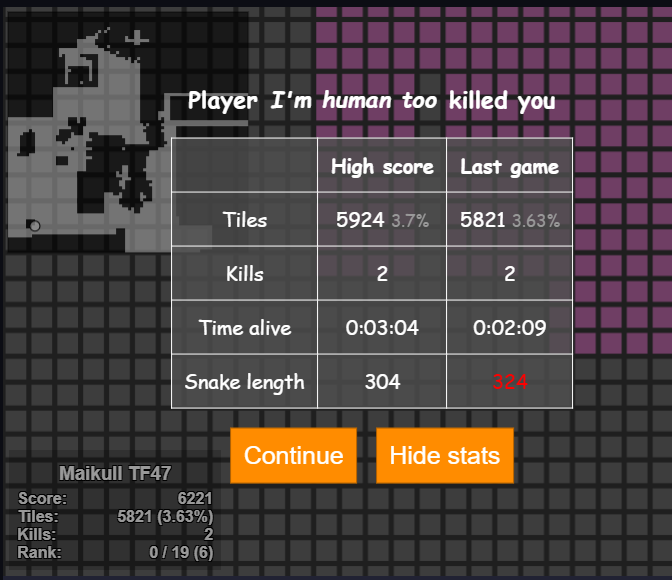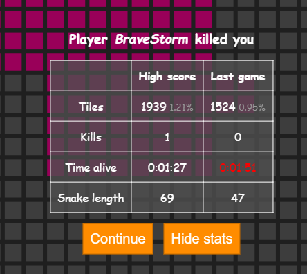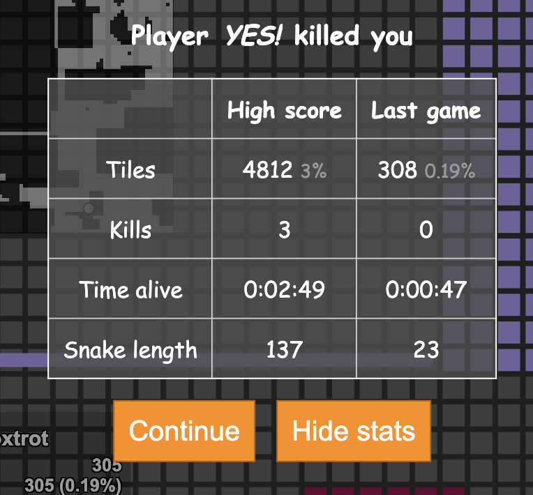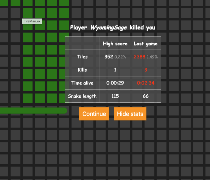 In this game, you must try to claim as much territory as possible. You start with a random block colour, and you must try to convert all the blocks on the map into the same colour. This might sound easy, but don’t forget there are other players to contend with! After dying you will be given a final score.